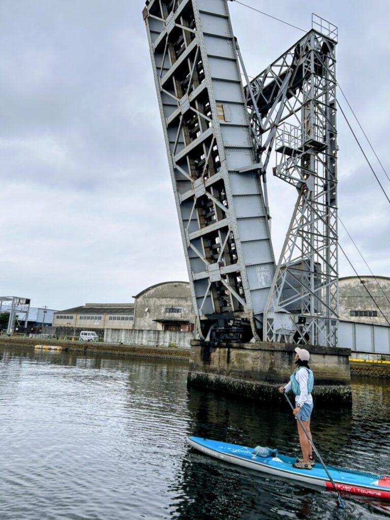 この2つの貴重な橋を、運河でSUPをしながら見ることができるとっても魅力的なコースでした。港湾ならではの倉庫群もまた素敵で、SUPを漕ぎなら四日市港の近代化の歴史をノスタルジックな空気を味わってきました。