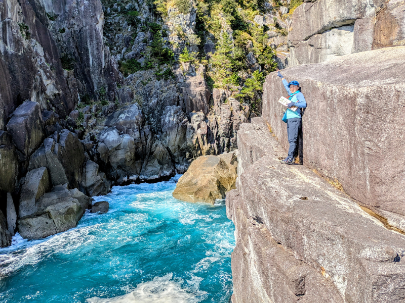 1月のツアーでは、丸太の「旧・景子橋」と。2月のツアーでは、アルミのピカピカの「新・景子橋」を踏みしめてきました。オハイの美しい海の色はもちろん大感動ですが、こんな景子橋のストーリーをとともに、登山道整備の過去、九鬼地域の歴史や習慣、今の暮らしについて楽しくガイドしてくれる景子ガイドならではのベルデのツアー。今年の冬も無事、開催できましたよ。